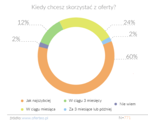 Aż 84% firm składających zlecenie w Oferteo.pl chce, żeby ich strona była gotowa najdalej w ciągu miesiąca, a najlepiej – jak najszybciej (60%). Tylko 12% zleceniodawców jest w stanie poczekać na realizację zamówienia do trzech miesięcy.