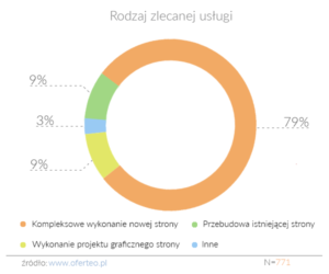 Dużo rzadziej zleceniodawcy decydują się na przebudowę dotychczas istniejącej strony – zdecydował się na to mniej niż co dziesiąty z nich. Samym projektem graficznym strony było zainteresowanych 9% przedsiębiorstw, a 6% miało jeszcze inne zlecenia, w tym np. zakodowanie strony www.