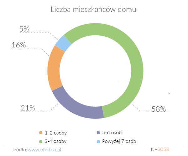 Instalacje OZE najczęściej miałyby być montowane w domach zamieszkiwanych przez 3-4 osoby (58% wszystkich zapytań ofertowych). W mniejszym stopniu zapytania dotyczyły domów, w których mieszka 5-6 osób (21%) lub 1-2 osoby (16%). Tylko 5% zapytań dotyczyło domów, w których mieszkało siedem i więcej osób.