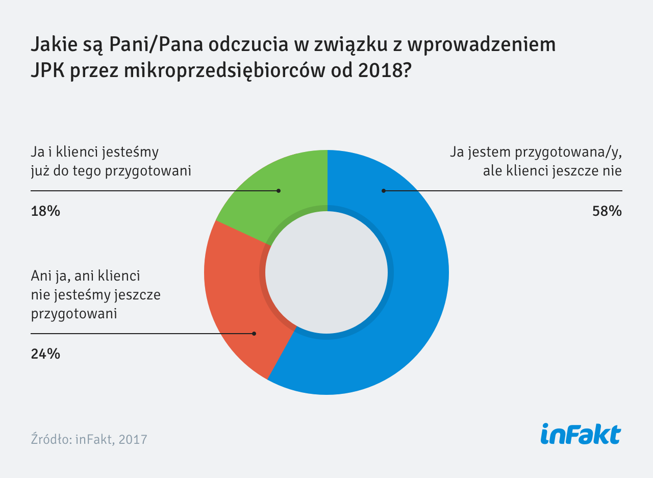 Tymczasem mikroprzedsiębiorcy, którzy już za trzy miesiące będą musieli wysłać do urzędu skarbowego pierwsze rozliczenie JPK_VAT, w większości nie są jeszcze do tego przygotowani. Prawie 70 proc. z ankietowanych przez inFakt nie wie, czy ich program księgowy jest przygotowany do wysyłki JPK. Jednocześnie tylko 13 proc. odpowiedziało, że ich program na to pozwala, taki sam odsetek wskazał, że jeszcze nie jest, ale będzie gotowy.