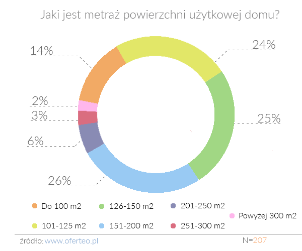 Podobnie jak w poprzednich latach najczęściej decydowano się na budowę domu o powierzchni użytkowej nieprzekraczającej 200 m2. Najpopularniejszym metrażem wśród ankietowanych przez Oferteo.pl był przedział 151–200 m2 – padło na niego 26% wskazań. Tylko o 1 pkt procentowy mniej osób wskazało na powierzchnię 126–150 m2, 24% badanych wskazało powierzchnię 101–125 m2, a 14% – do 100 m2.