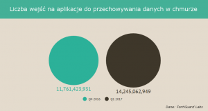 Eksperci firmy Fortinet zmierzyli, że dostęp do aplikacji chmurowych służących do przechowywania danych wzrósł w przeciągu kilku miesięcy na przełomie 2016 i 2017 roku o 21%. W pierwszym kwartale 2017 roku zanotowano ponad 14 miliardów przypadków stosowania tego typu rozwiązań w porównaniu do 11,7 miliarda w czwartym kwartale 2016 roku.