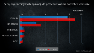 Spośród konkretnych aplikacji tego typu najpopularniejsza okazała się usługa firmy Apple – iCloud. Na drugim miejscu znalazł się Dropbox, a na kolejnych – One Drive, Dysk Google oraz Box. Dane wskazują również na to, że poziom wykorzystania mobilnych aplikacji chmurowych rośnie wyraźnie szybciej niż aplikacji stosowanych zazwyczaj na urządzeniach stacjonarnych.